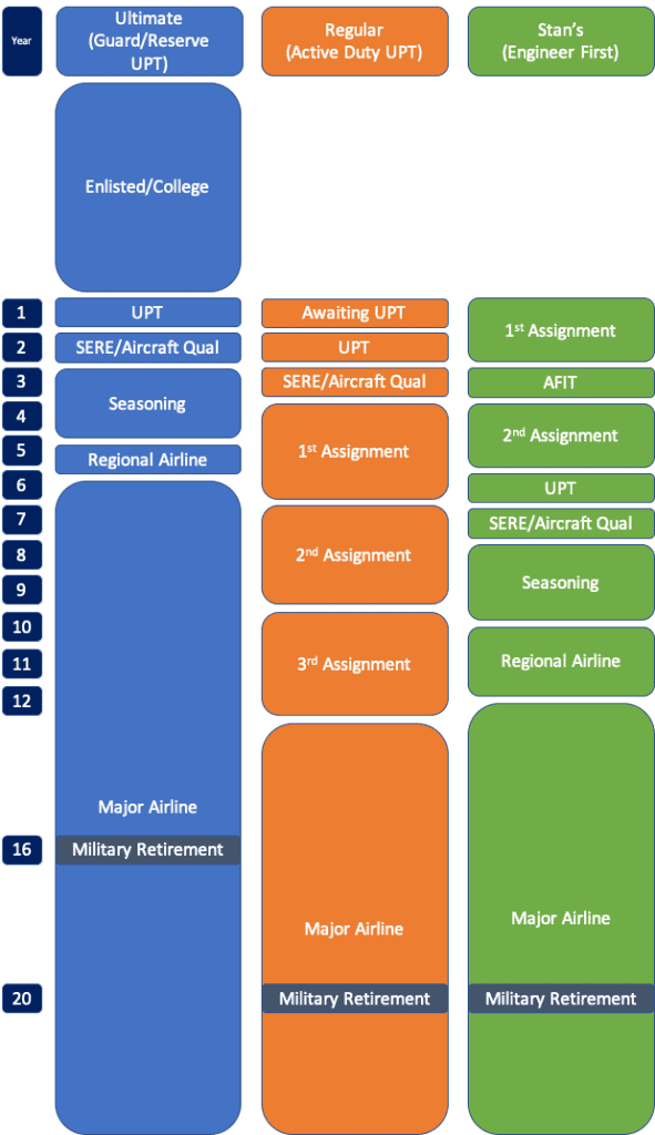 Let’s assume though that Stan can get hired by a unit, and is scheduled to start UPT as soon as his regular ADSC is up. He’d still have to go through steps 2-5 from the Active Duty pilot career path above! That’s at least 2 moves and several TDYs in the space of about 2 years. Having been out of college for at least 5 years at the start of UPT, it’s more likely that Stan will have a spouse and kids...making the very busy year at UPT even more challenging.