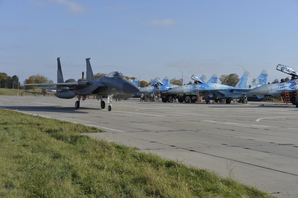 A U.S. Air Force F-15C Eagle assigned to the 144th Fighter Wing, 194th Fighter Squadron, Fresno Air National Guard Base, California, taxis past Ukrainian Sukhoi Su-27 Flankers during the Clear Sky 18 exercise at Starokostiantyniv Air Base, Ukraine, Oct. 9, 2018. Clear Sky 18 promotes regional stability and security, while strengthening partner capabilities and fostering trust. (U.S. Air National Guard photo by Tech. Sgt. Charles Vaughn)